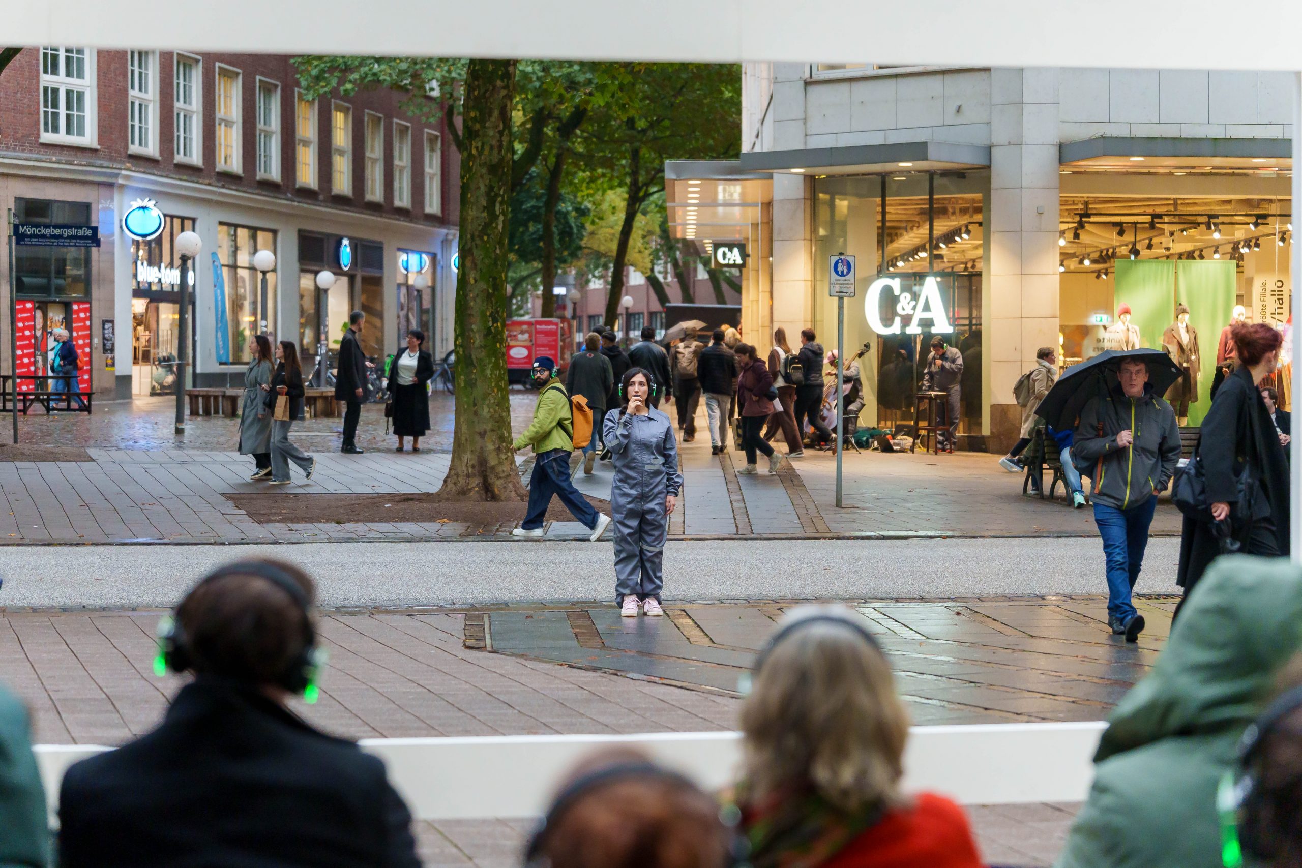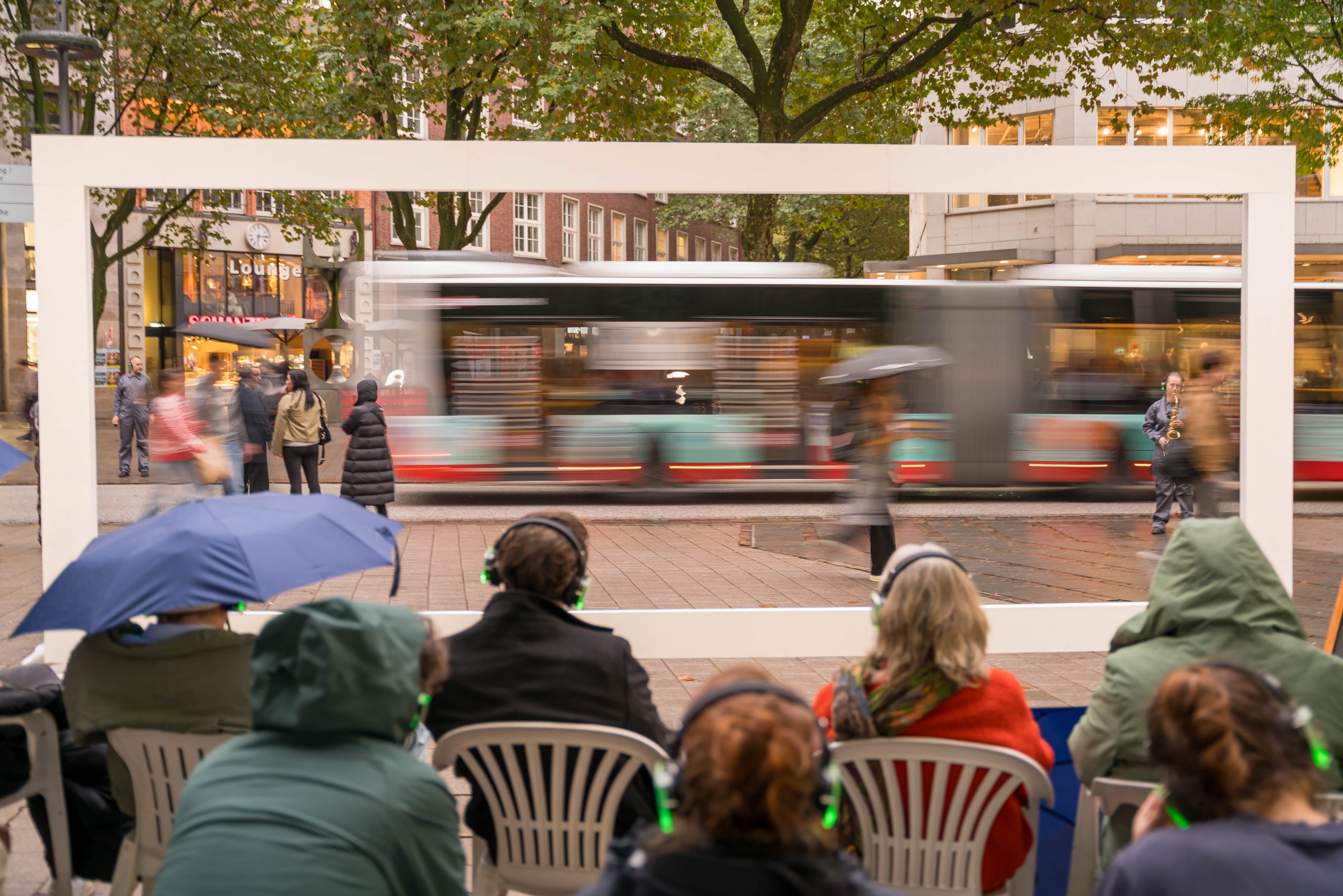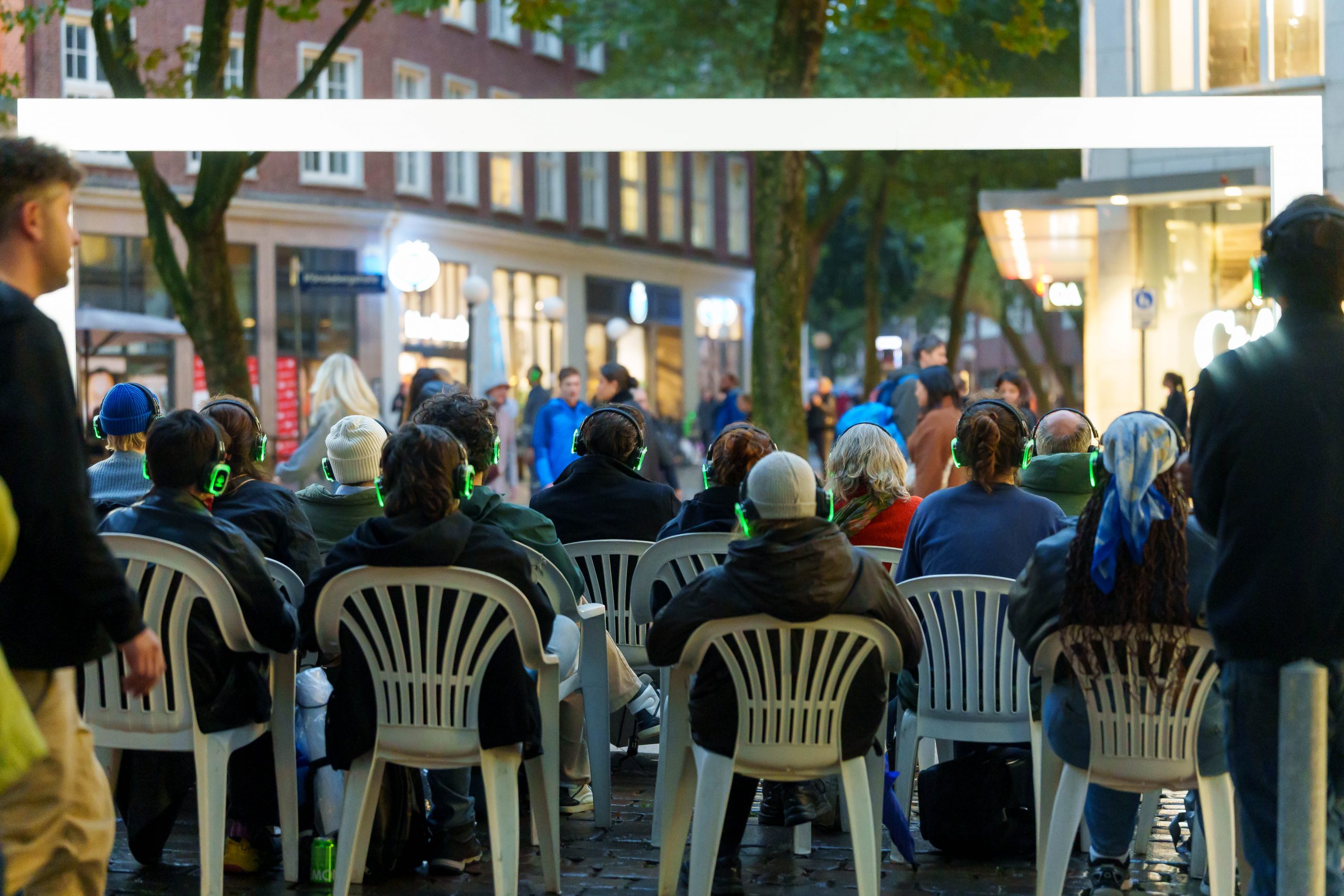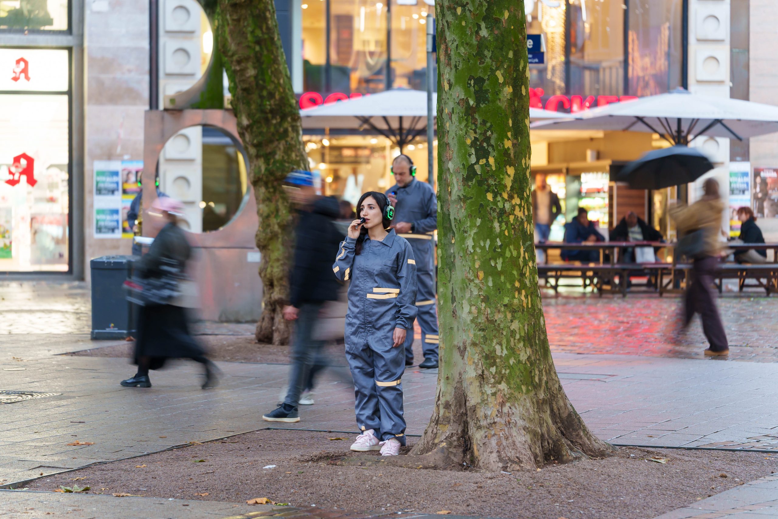 WAR WHISPERS, invites you on a multi-layered sound expedition: against the backdrop of historical architecture, where power and everyday life meet, the public space becomes a listening space. Sounds composed in real time merge with the metropolitan soundscape as the musicians move through the cityscape. At the centre is the haunting voice of poet Etel Adnan, whose text ‘To be in a time of war’ is ‘whispered’ directly into the audience’s ears via headphones. WAR WHISPERS explores the question of how people live in the tension between everyday life and violence. The result is a fragile web of sound that draws the listener into an acoustic hidden object: sometimes close and personal, sometimes overwhelming and alien, between the lived present and the reverberations of wars not far away.
