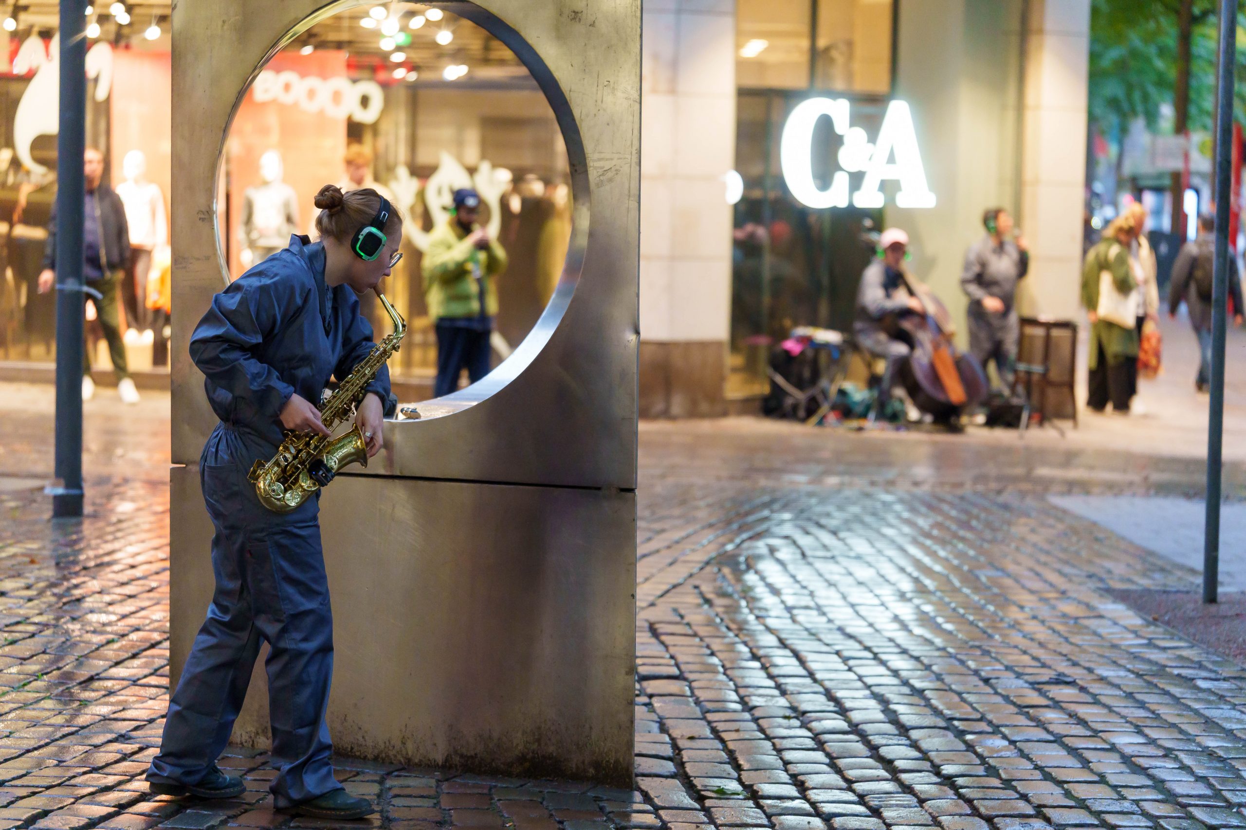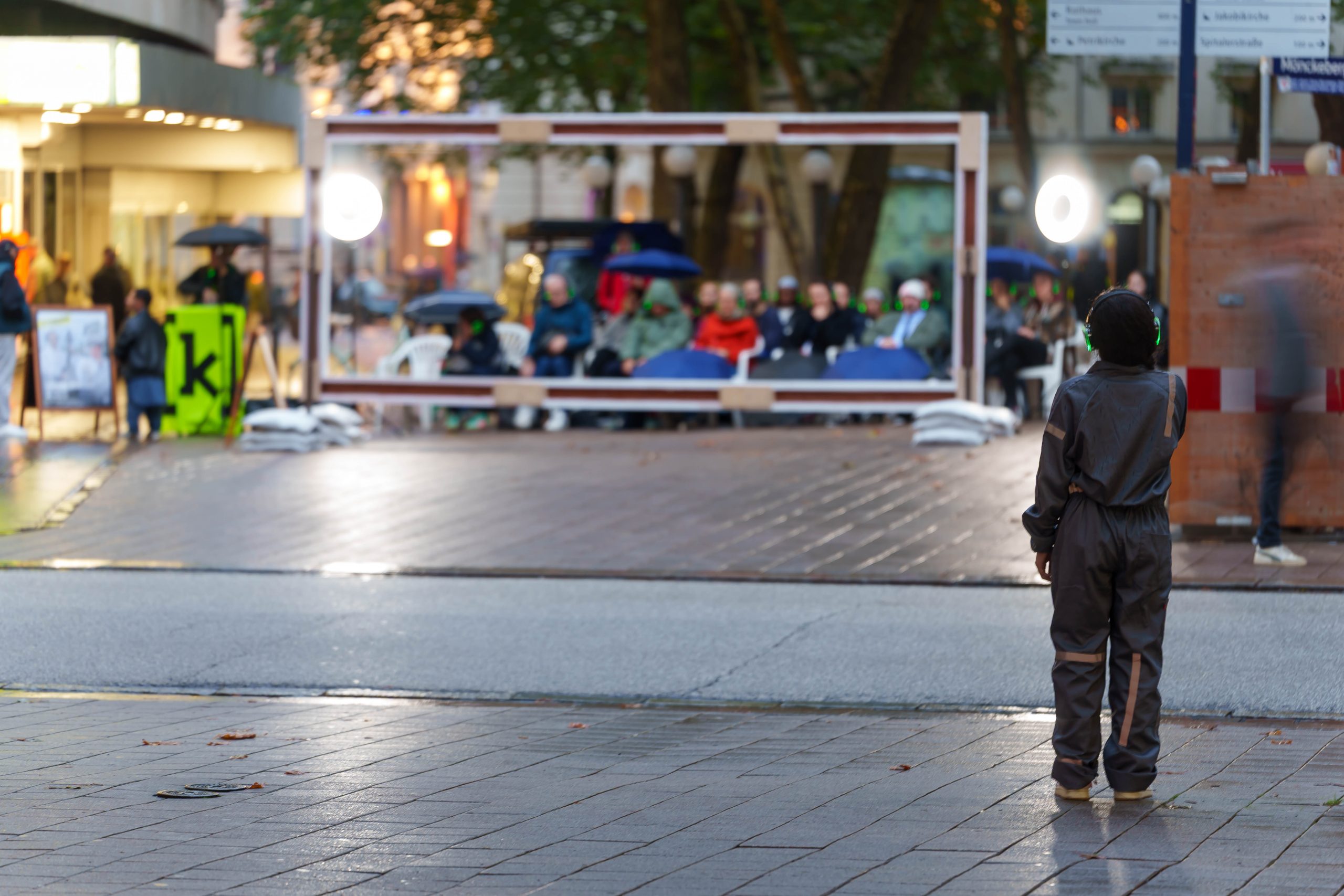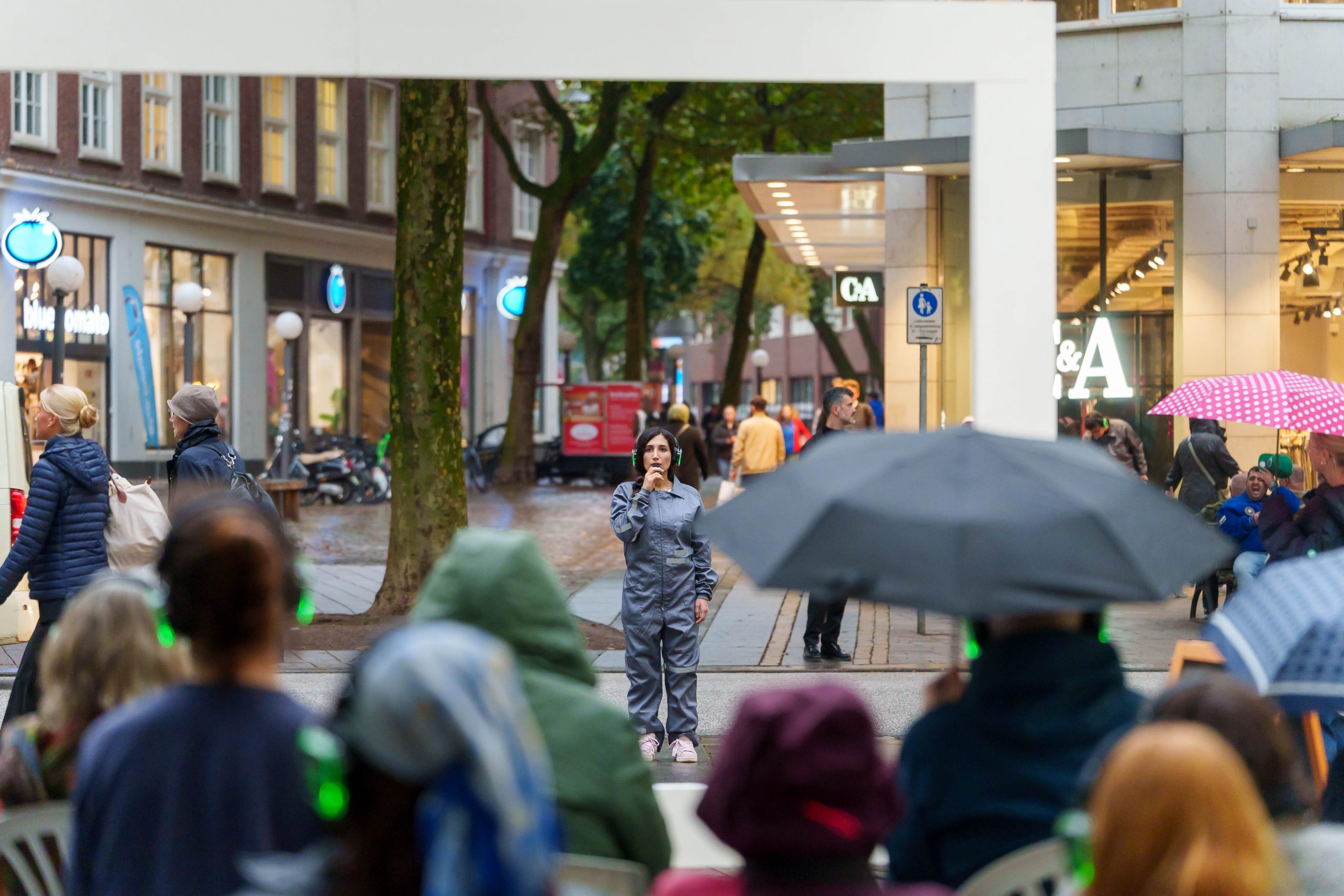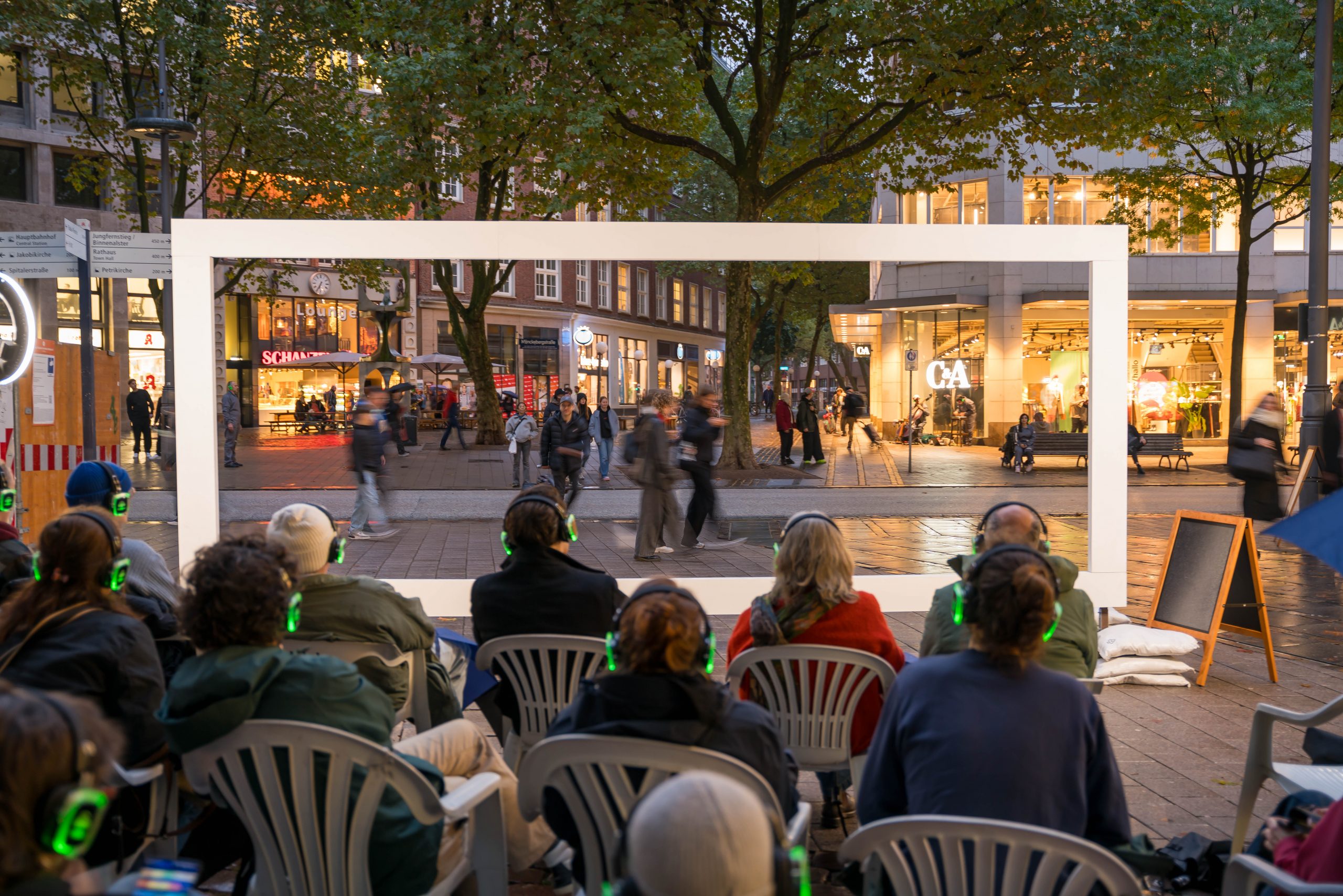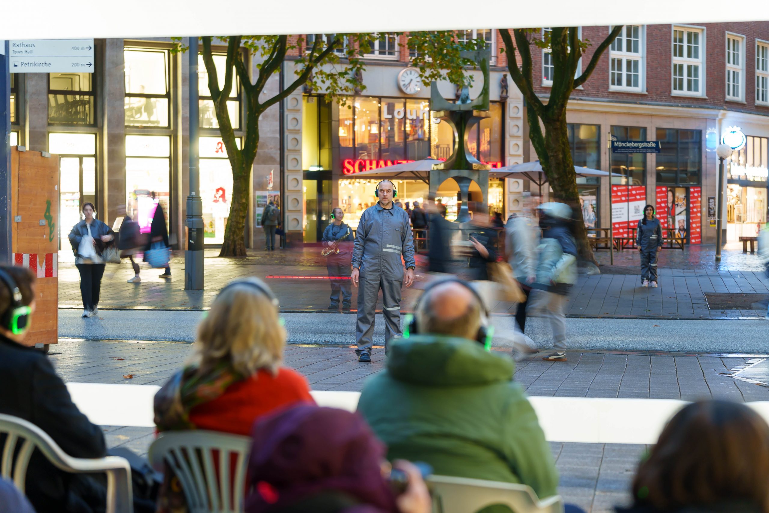 WAR WHISPERS, invites you on a multi-layered sound expedition: against the backdrop of historical architecture, where power and everyday life meet, the public space becomes a listening space. Sounds composed in real time merge with the metropolitan soundscape as the musicians move through the cityscape. At the centre is the haunting voice of poet Etel Adnan, whose text ‘To be in a time of war’ is ‘whispered’ directly into the audience’s ears via headphones. WAR WHISPERS explores the question of how people live in the tension between everyday life and violence. The result is a fragile web of sound that draws the listener into an acoustic hidden object: sometimes close and personal, sometimes overwhelming and alien, between the lived present and the reverberations of wars not far away.